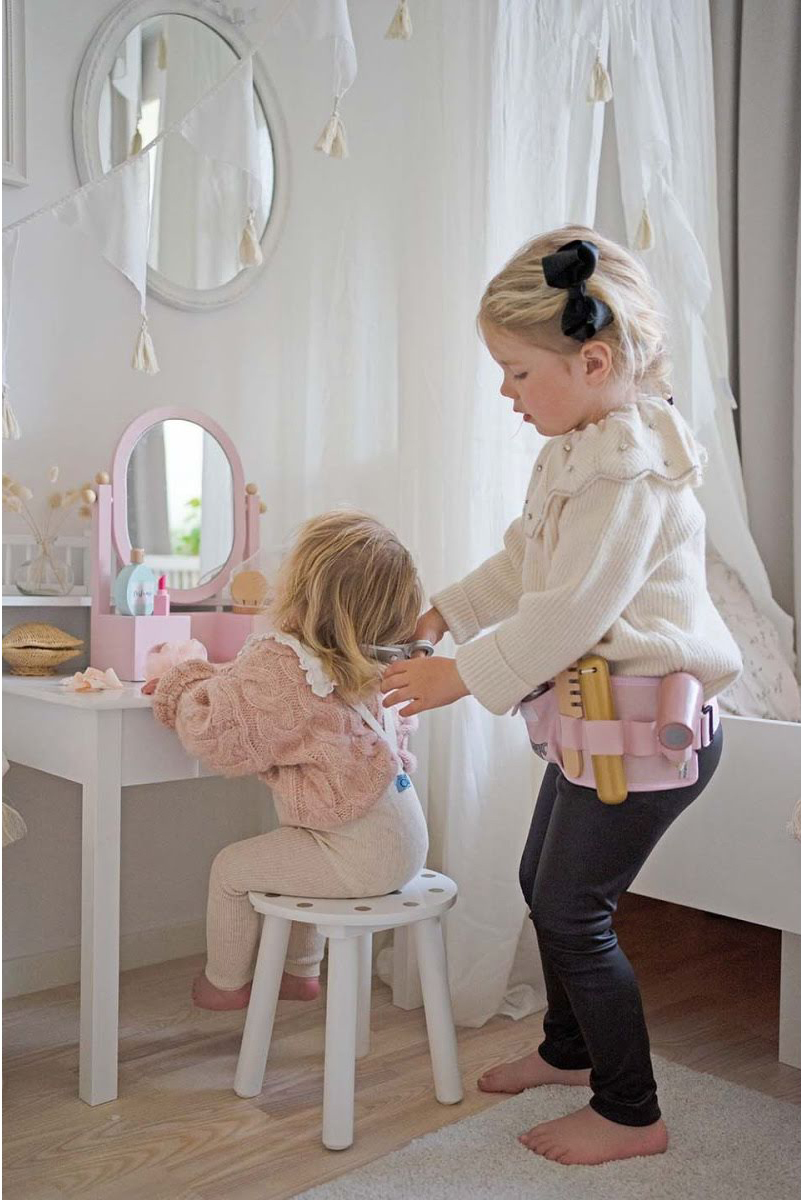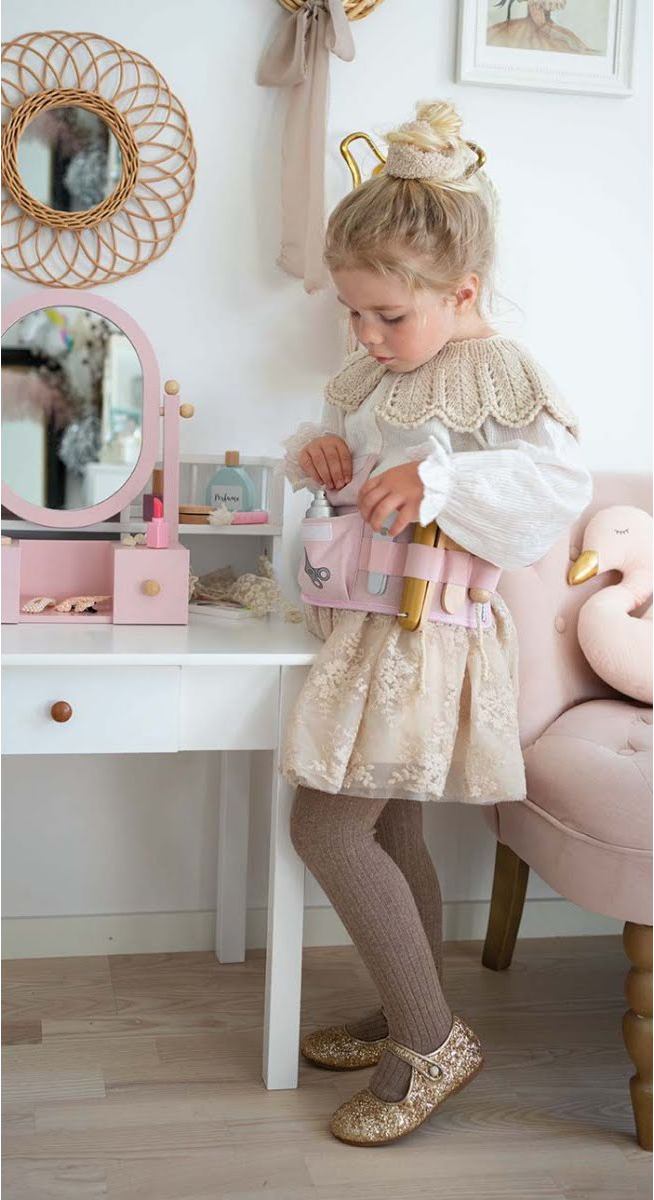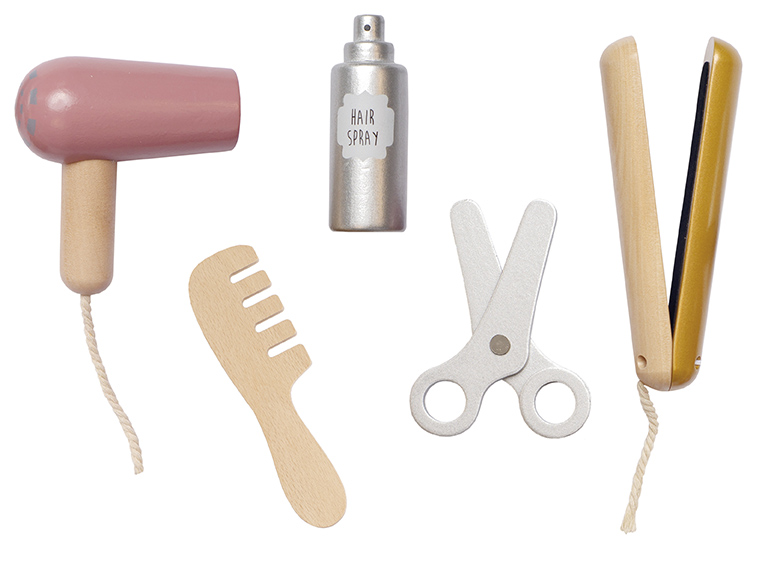 Το σετ κομμωτικής περιέχει: 1 ρυθμιζόμενη ζώνη με κούμπωμα, 1 πιστολάκι μαλλιών, 1 χτένα, 1 ισιωτικό, 1 ψαλίδι και 1 μπουκάλι σπρέι μαλλιών.