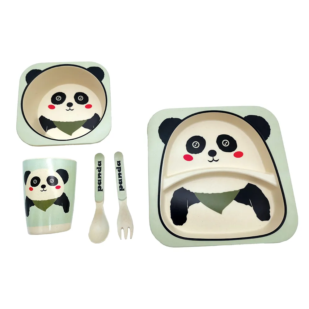 Σετ φαγητού κατασκευασμένο από μπαμπού με πάντα, σετ πέντε τεμαχίων αποτελούμενο από 2 πιάτα, ποτήρι, πιρούνι και κουτάλι.